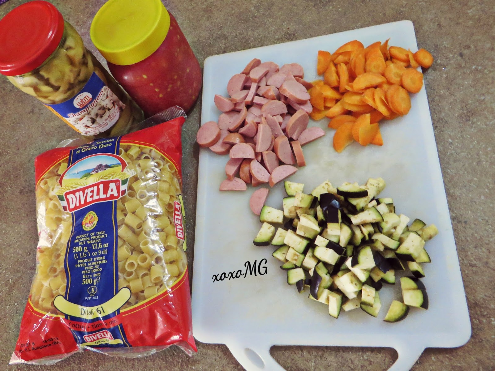 - Then firstly put the sausage and let it fry a little. Then add the carrots and the eggplant finely chopped. Let them cook slowly.